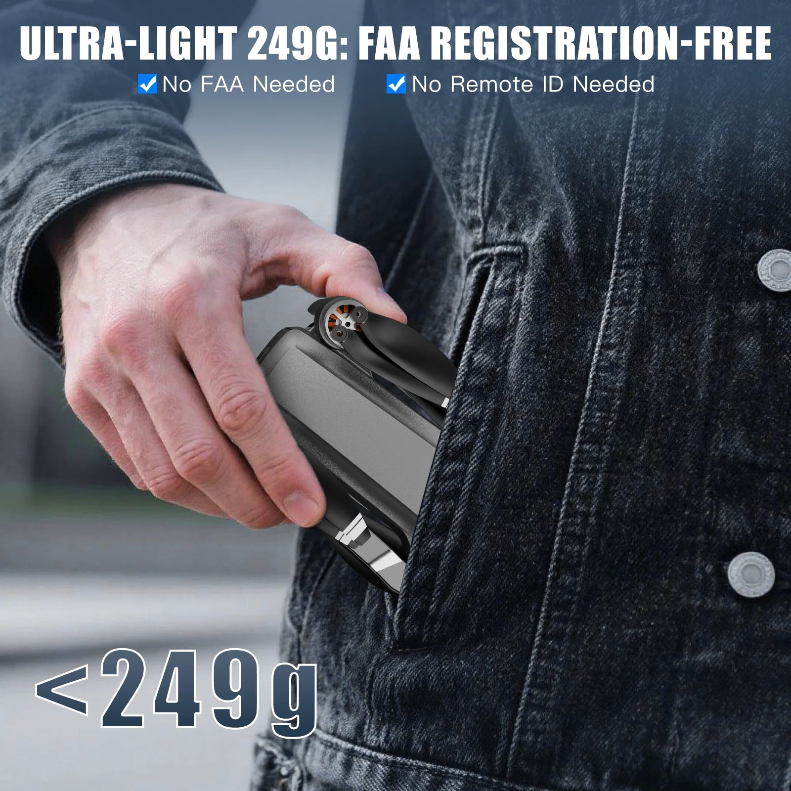 Weighing less than 249 grams, this drone complies with FAA regulations, eliminating the need for registration or remote identification when used recreationally in the United States.